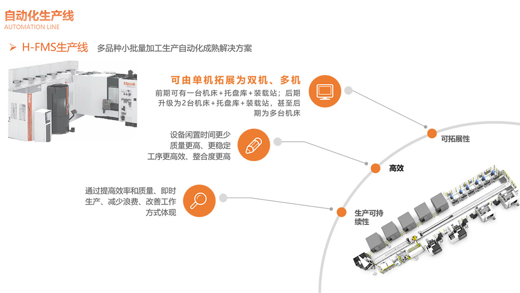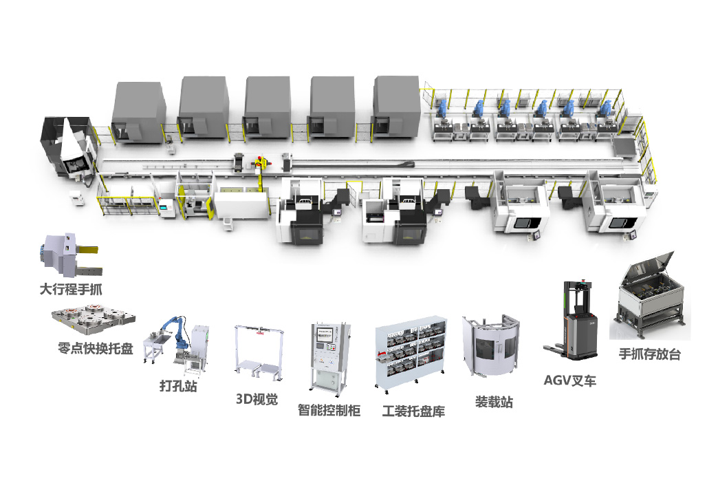 FMS柔性加工生產線特點: 1.通過管理軟件LMS保證自動線運轉,并與上下游進行信息交互;2.自動上下料—AGV物料轉運;3.自動工件識別—3D視覺識別毛坯種類,引導抓取;4.工件自動找正、定位;5.自動傳輸程序、自動測量;6.機床產能智能分配,每臺機床可加工不同產品;根據不同產品自動加工排氣孔。